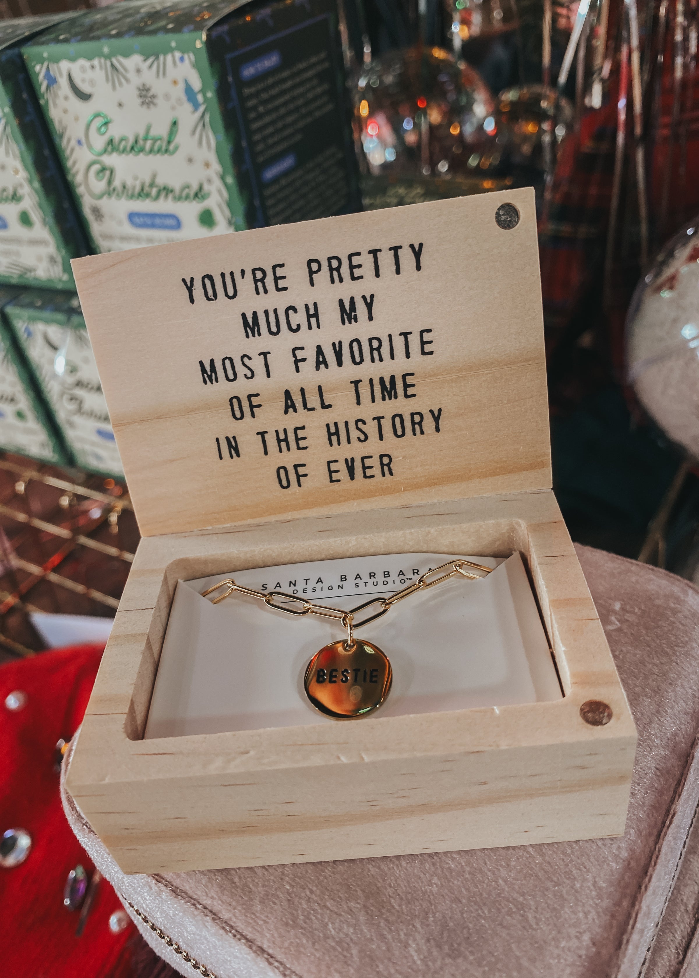 This beautiful chain link necklace is the perfect trendy gift for a special best friend. Pendant link necklace comes in a sweet wooden giftbox. · Wooden gift box reads "YOU'RE PRETTY MUCH MY FAVORITE OF ALL TIME IN THE HISTORY OF EVER" · Material: Pine, Zinc Alloy, Stainless Steel · Size: 17-19" Chain · Care Instructions: Wipe with polishing cloth or jewelry cleaner.