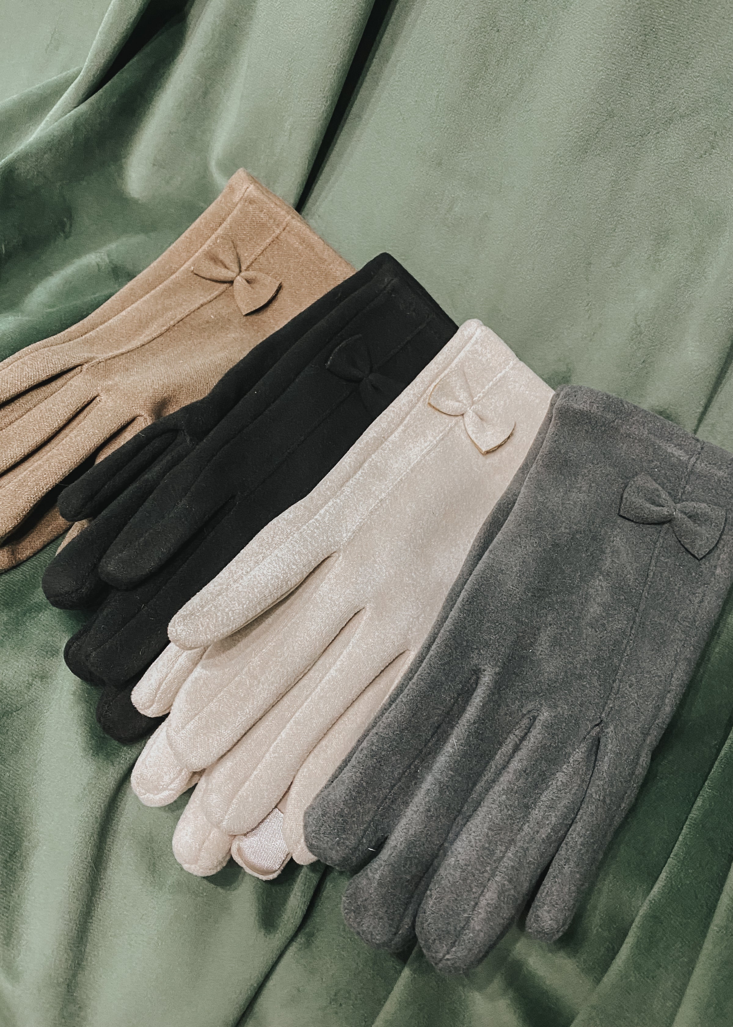 Women's Vegan Suede Faux Ribbon Bow Accent Winter Gloves with Touch Screen Compatible Finger Tip Pad
