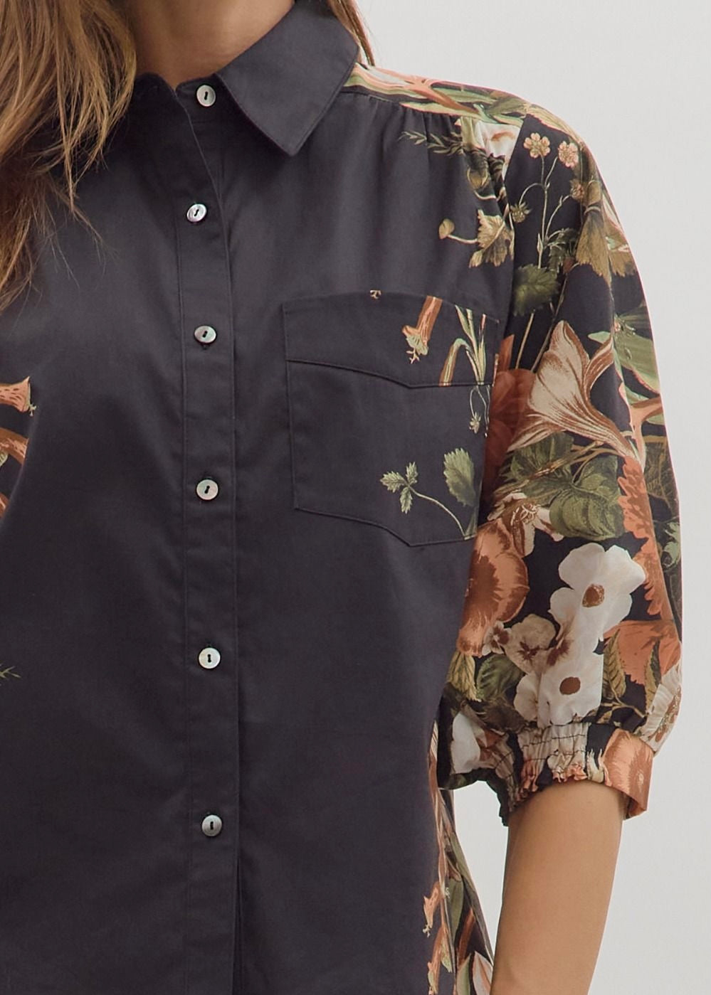 Floral print cuff band ¾ sleeve collar button front shirt. Unlined. Woven. Non-sheer. Lightweight.