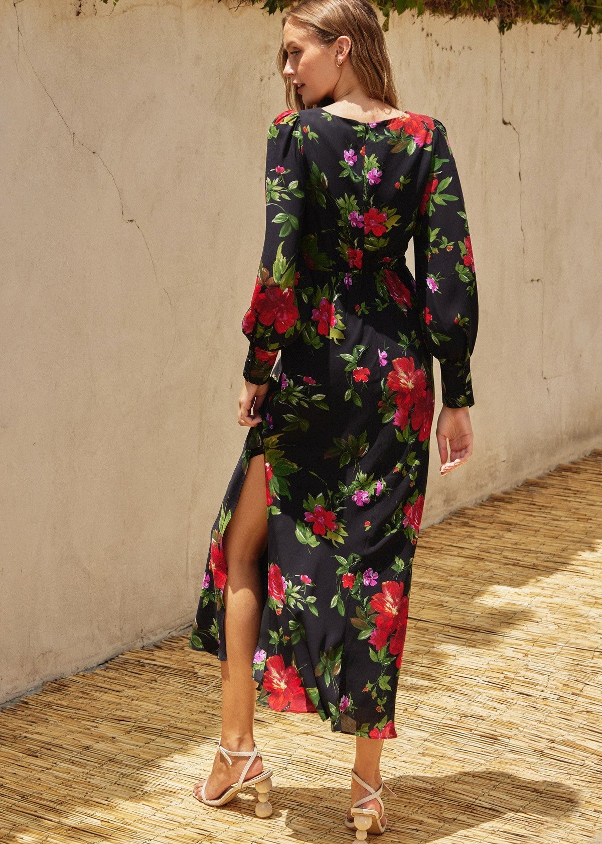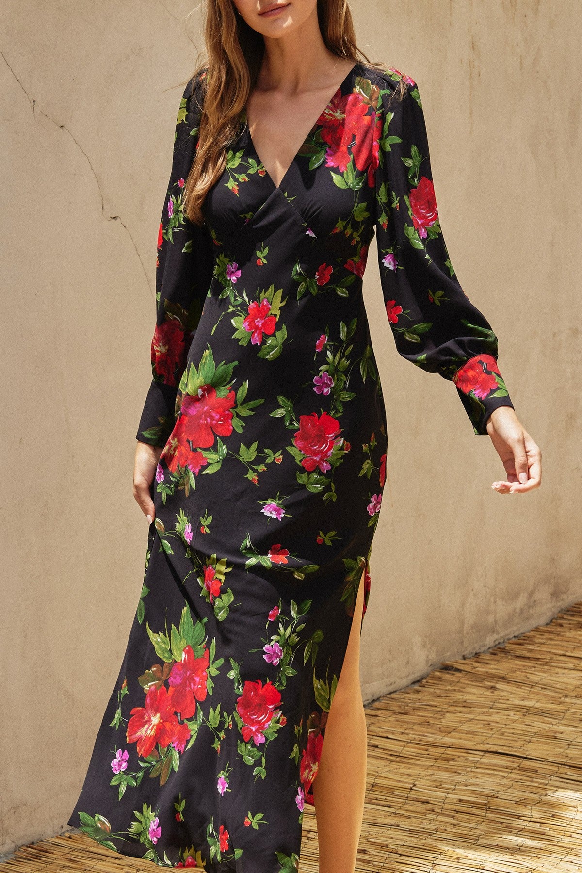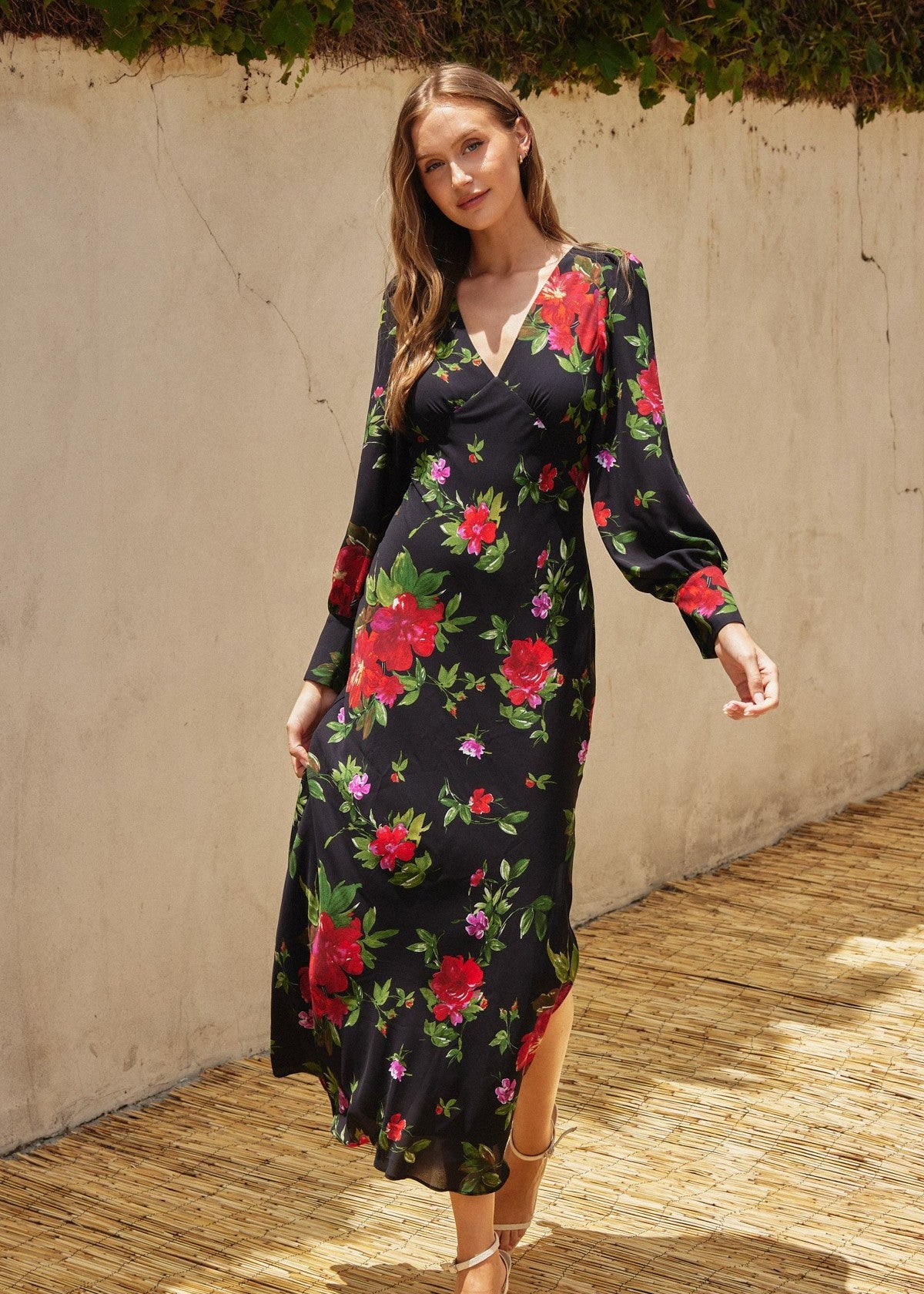 Floral print maxi dress with long sleeves and bishop sleeves.