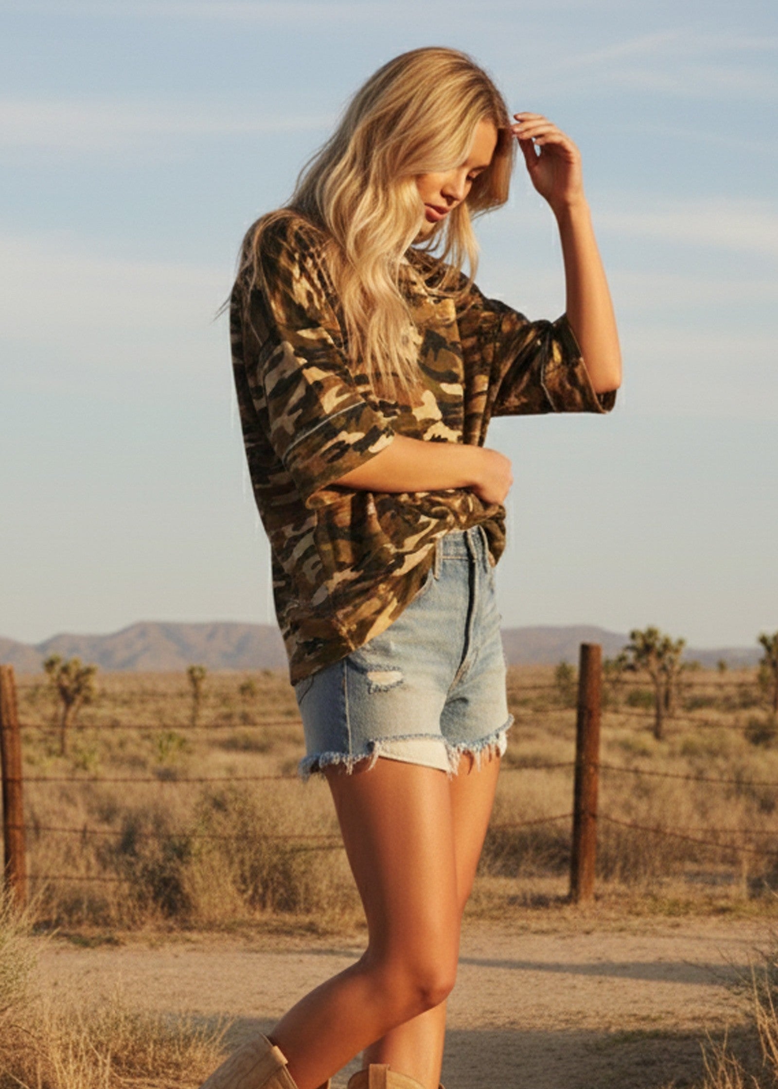 Rock an edgy-casual look with this camo tee that's all about laid-back confidence. The relaxed, boxy fit and contrast stitching give it serious attitude, while the soft fabric keeps things comfy for all-day wear. Whether you're heading to the tailgate, running errands, or just vibing with friends, this slouchy number pairs perfectly with denim or joggers for that effortless cool-girl energy. It's the kind of top that makes any outfit feel intentional and fun.