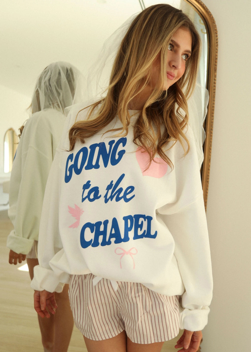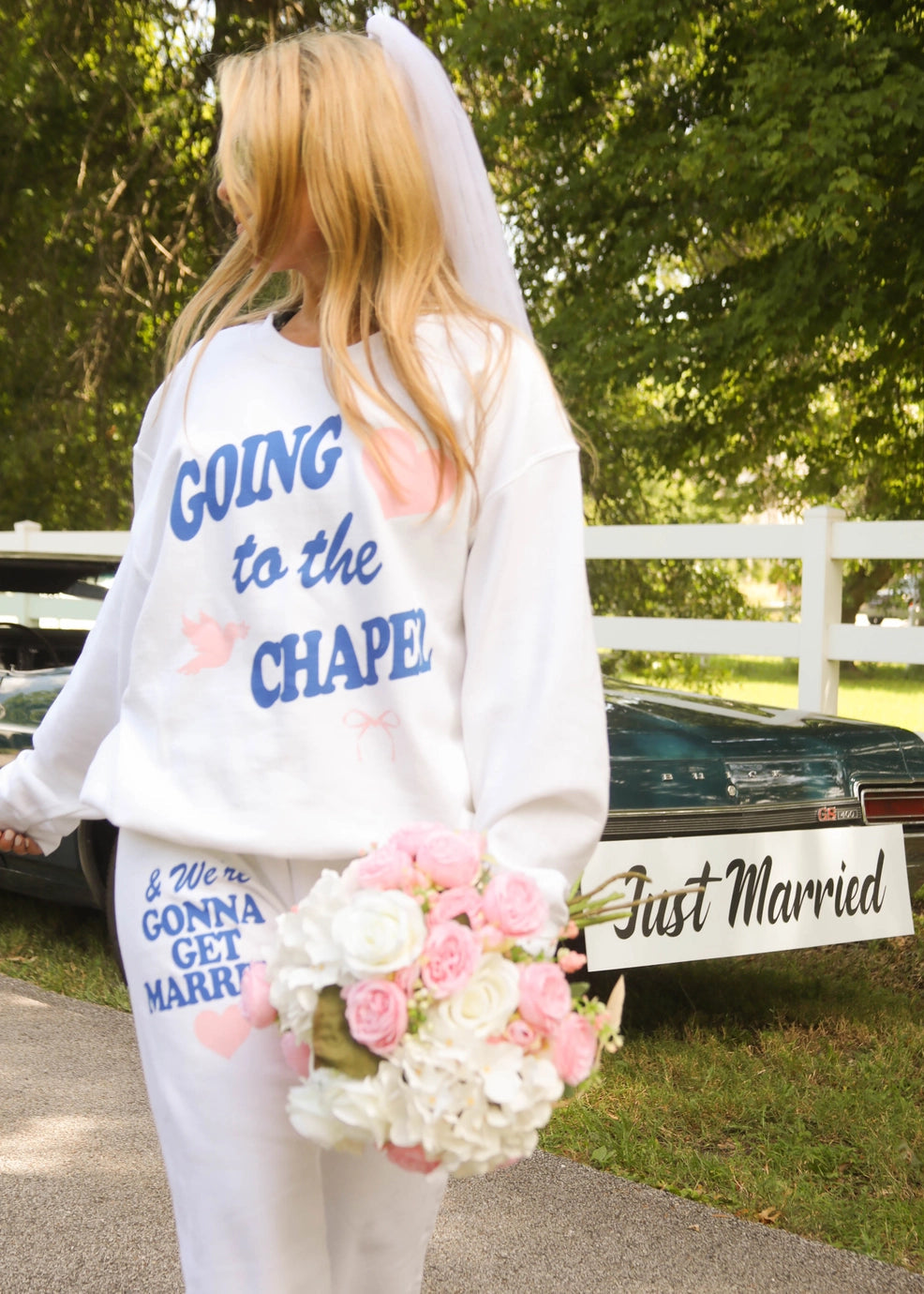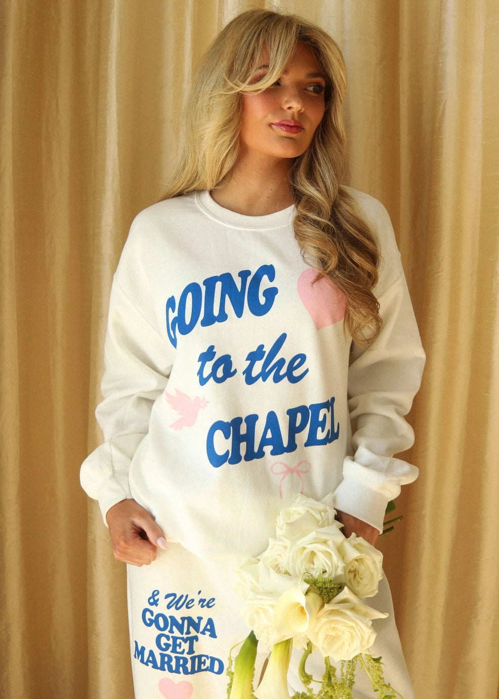 The iconic, Going to the Chapel Sweatshirt is here to stay! This white crewneck features a blue and pink graphic complete with a pink heart and love bird, and can be paired with the matching sweatpants. Don't miss out on this one.