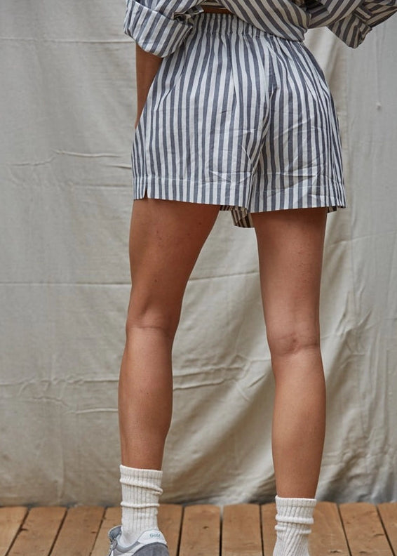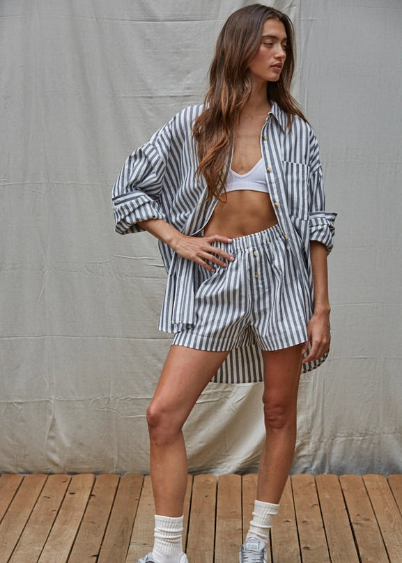 Effortless comfort meets timeless style with these woven cotton striped shorts. Featuring a relaxed wide-leg silhouette, an elastic waistband for all-day ease, and decorative button trim detailing, they're perfect for casual weekends or laid-back getaways. The classic striped pattern adds visual interest while the breathable cotton keeps you cool. A wardrobe essential that transitions seamlessly from day to night.