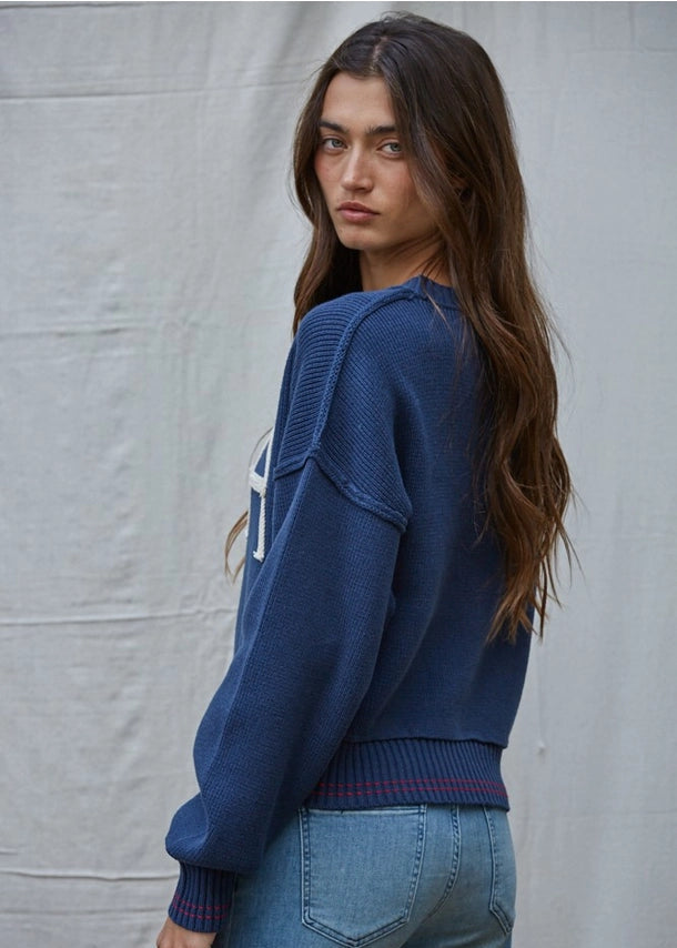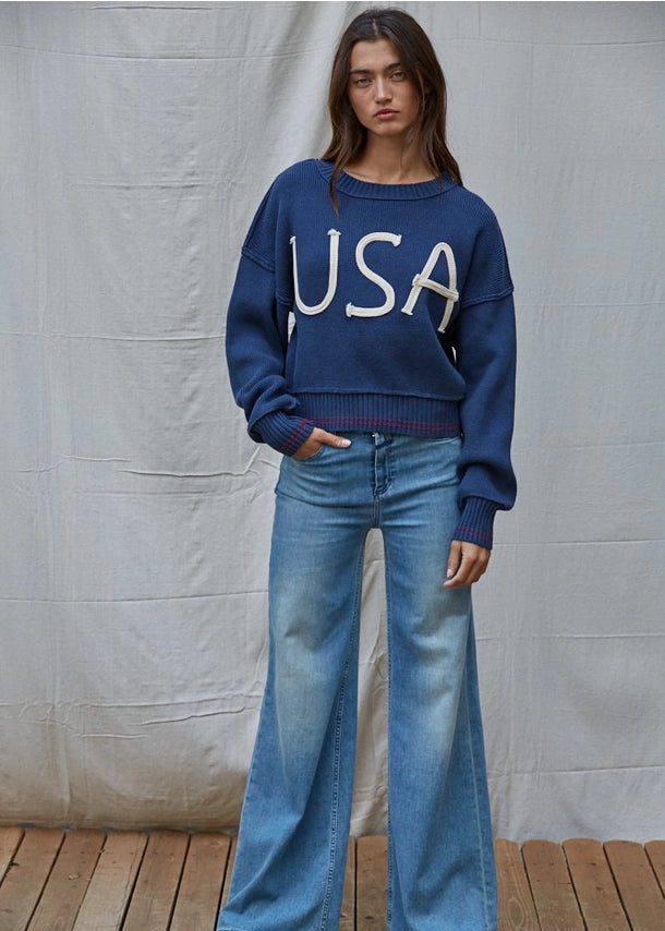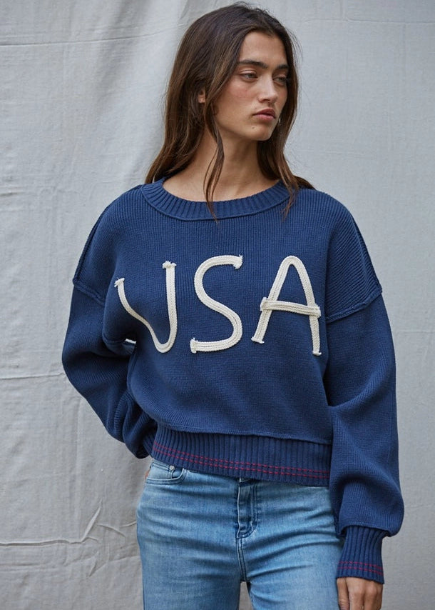Cozy knit sweater crafted from a soft cotton, acrylic, and polyester blend. Features a classic crew neck and long sleeves for everyday warmth. The pullover design makes it easy to slip on, while bold embroidered "USA" letters on the chest add patriotic flair. Contrast stitching along the bottom hem provides a polished, finished look. Perfect for casual wear, layering, or showing your pride in style.