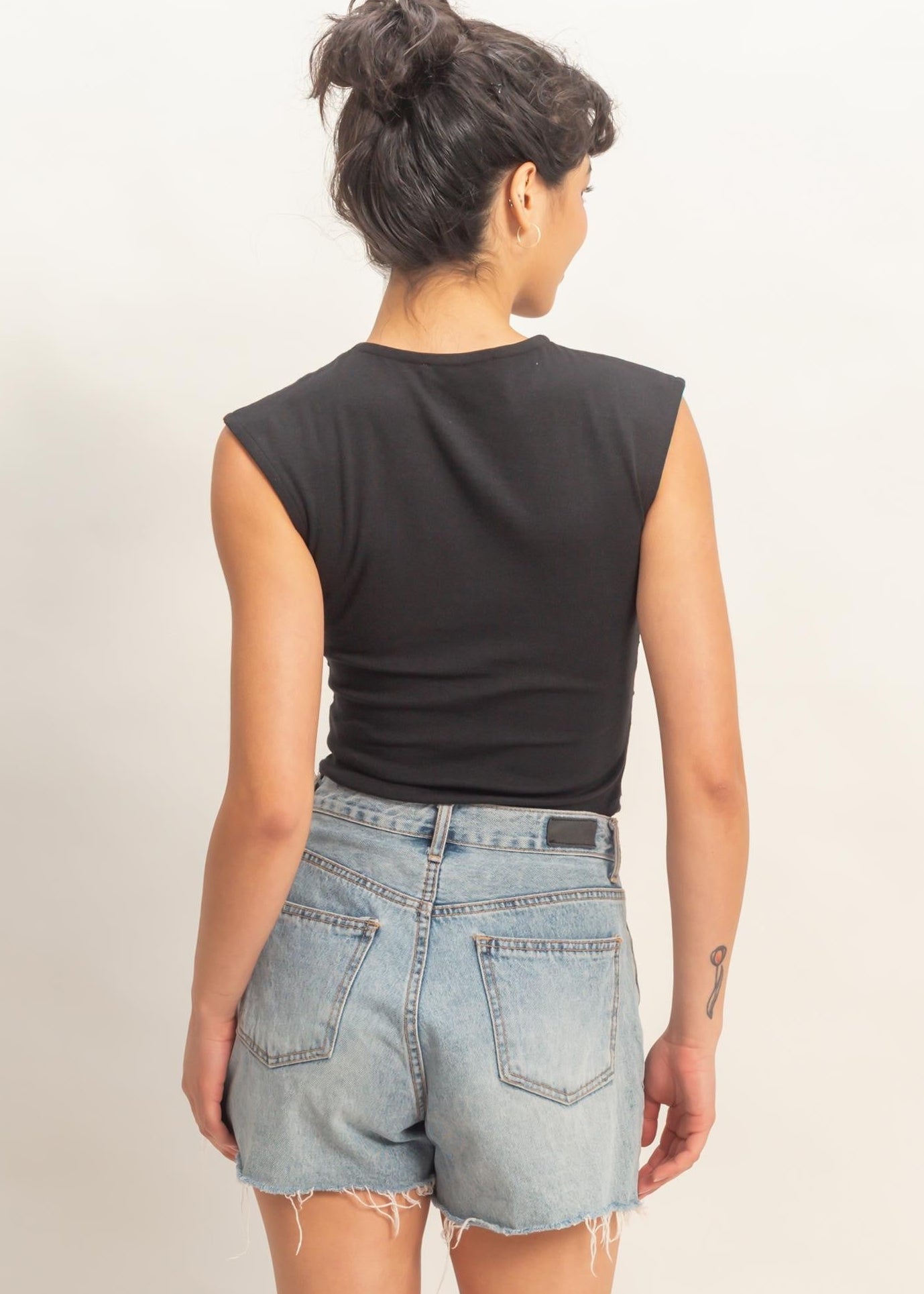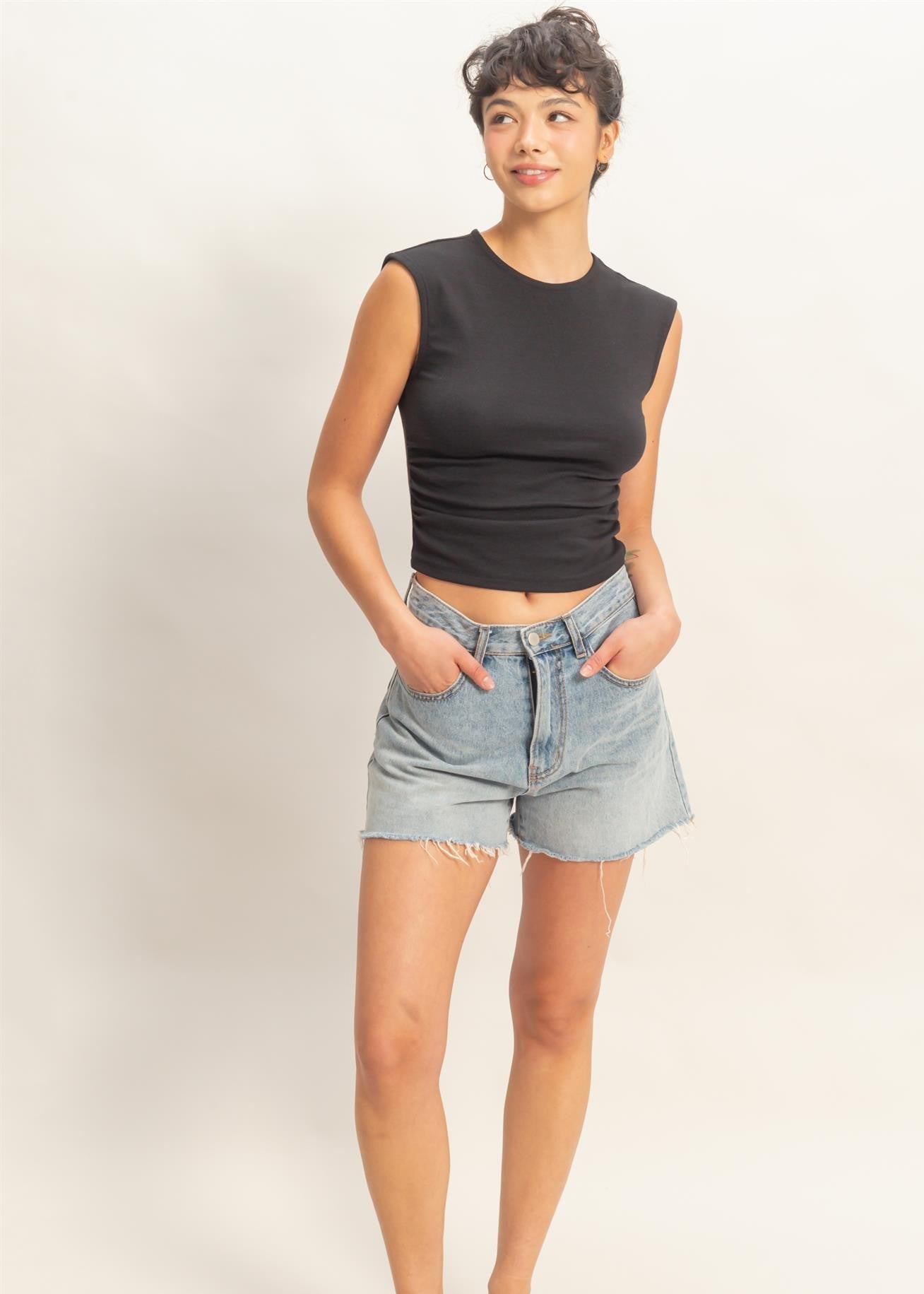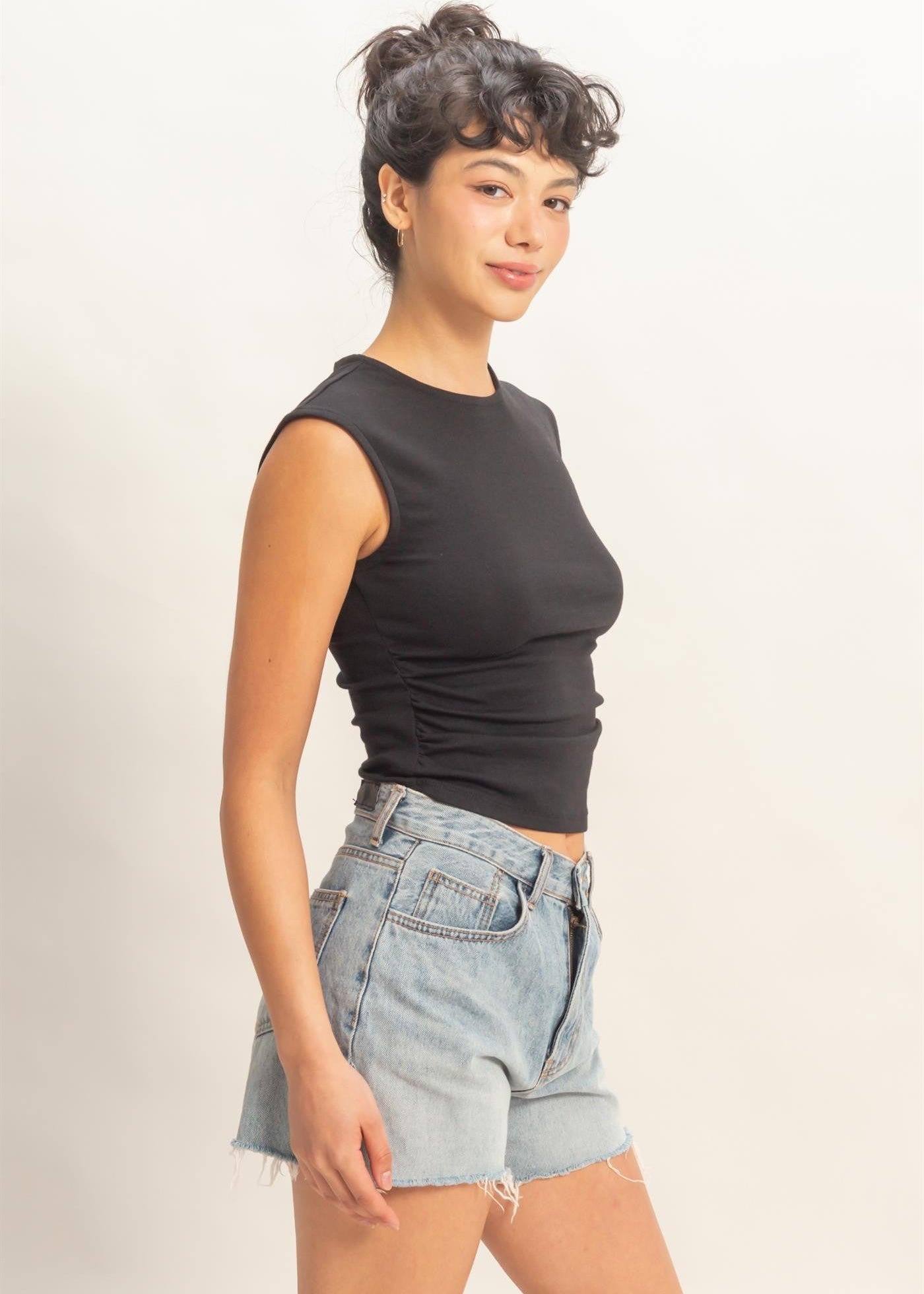 Define your silhouette with this soft knit top, made from a flexible cotton-rayon-spandex blend. It boasts a smooth round neckline and extended shoulders for a modern sleeveless look. The design features flattering side ruching, creating a contoured, gathered fit. Pair with high-waisted jeans and ankle boots for a chic, sophisticated ensemble.