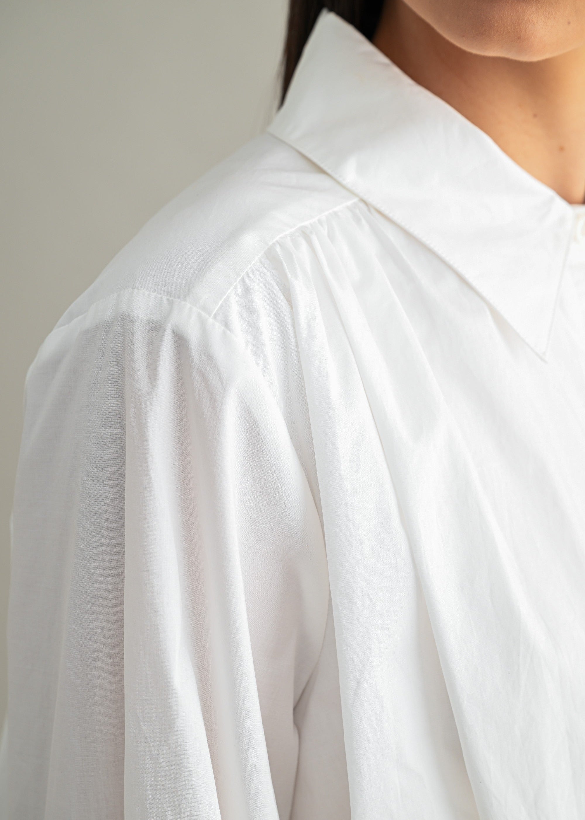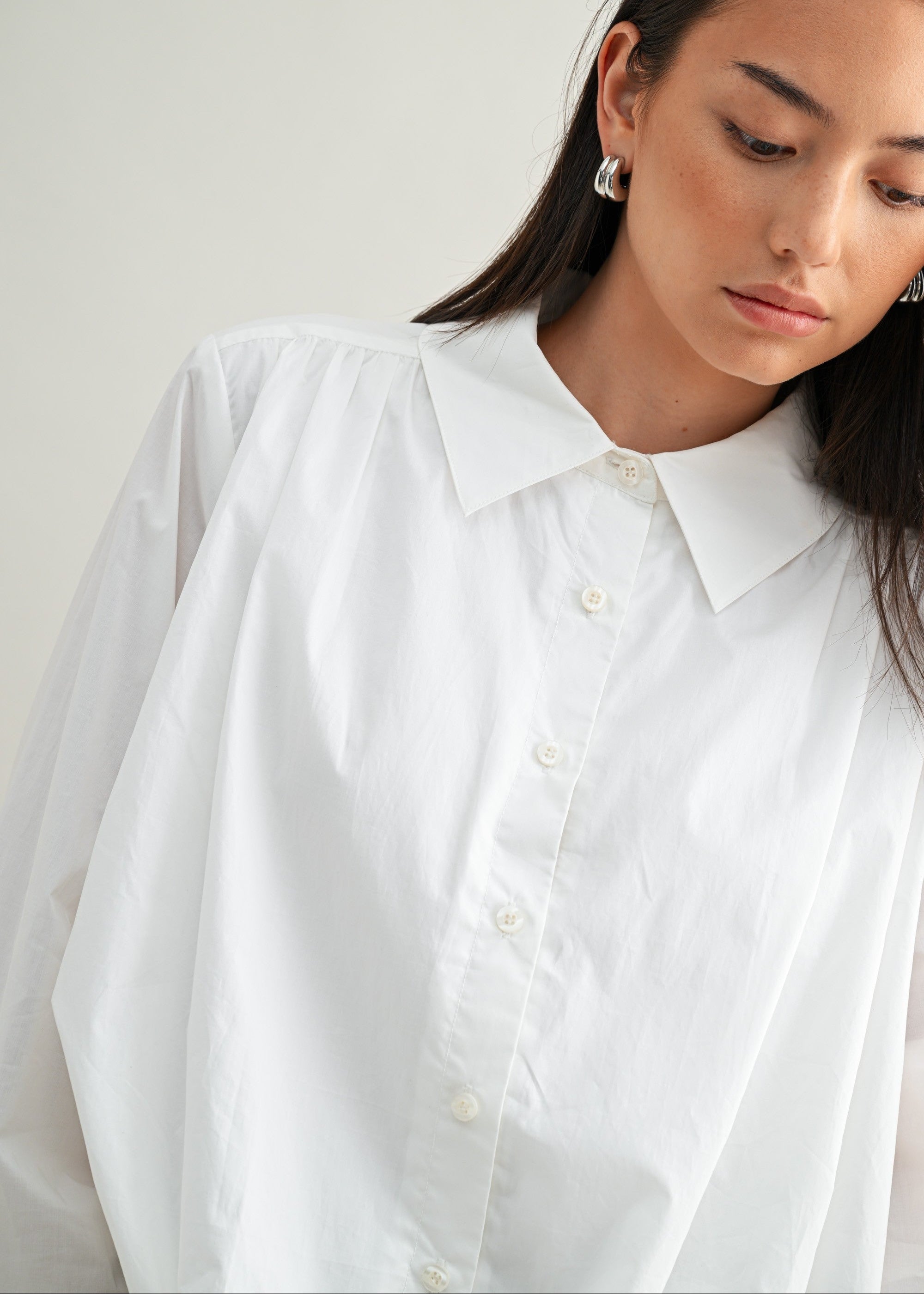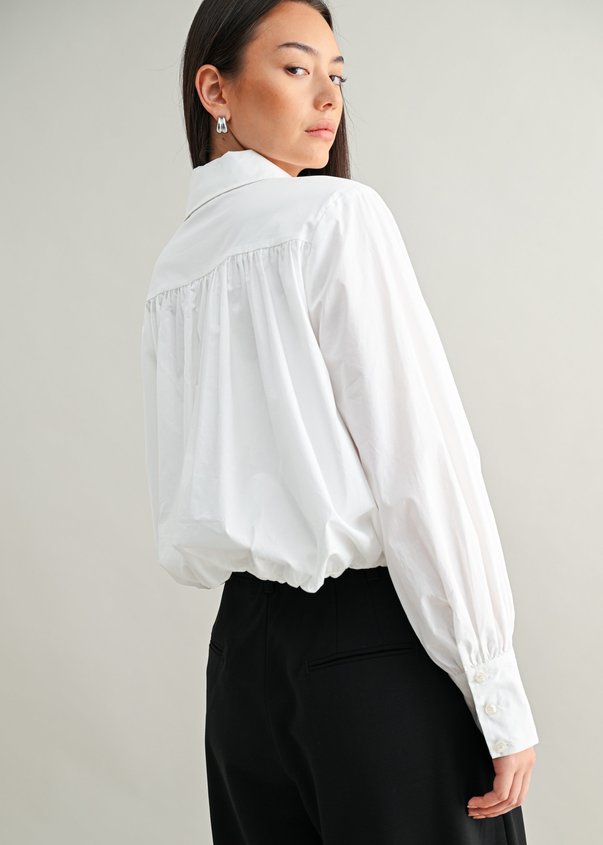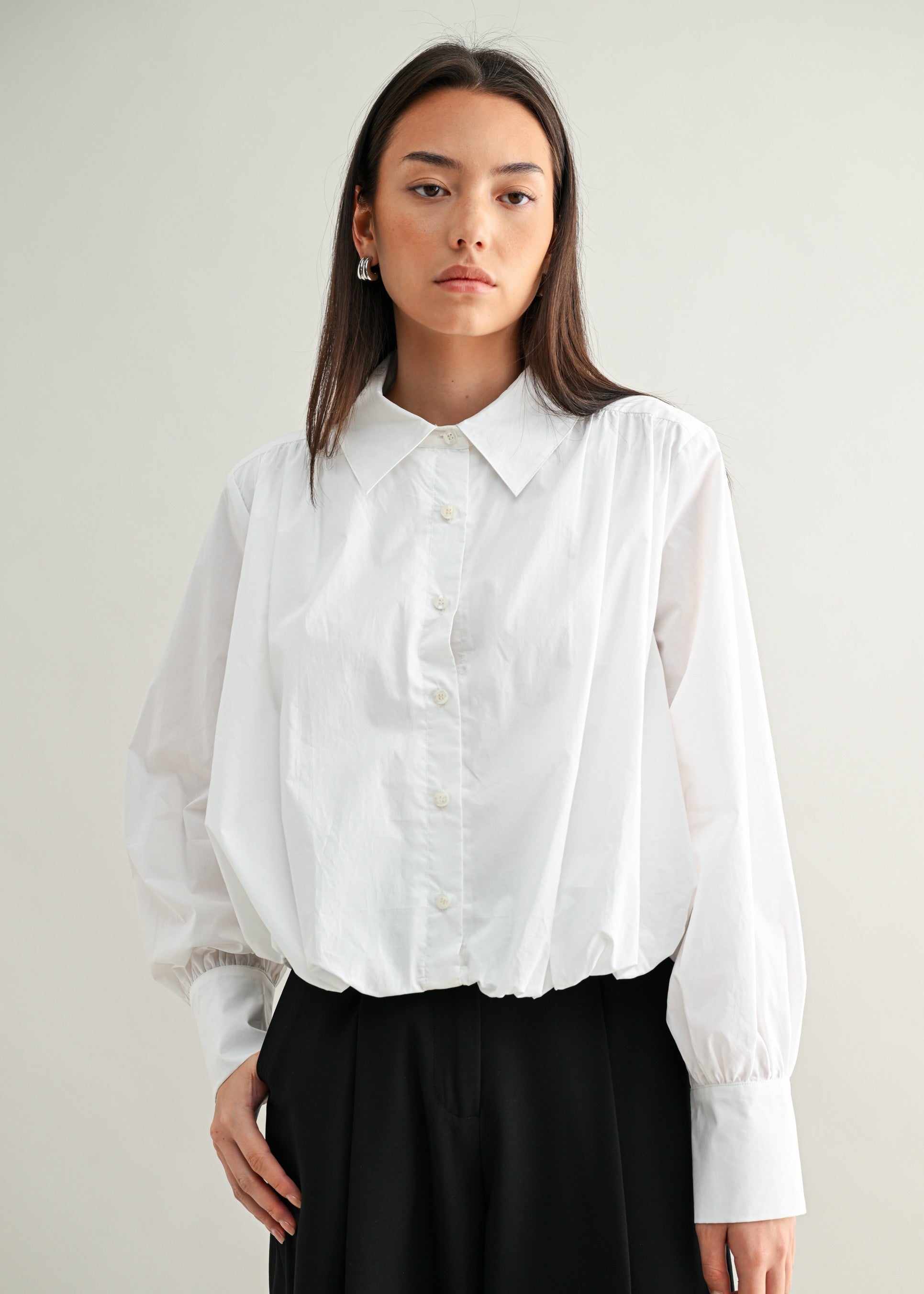 Effortlessly chic meets wonderfully comfortable in this cotton button-down that's anything but basic. The pointed collar and full front buttons give you polished appeal, while the gathered back yoke and subtle bubble hem create flattering volume without the fuss. Slip into the softly bloused silhouette, push up those generously cuffed sleeves, and let the elasticized hem keep everything in place. Lined for a smooth finish against your skin, this is the shirt that works as hard as you do—whether you're conquering the day or keeping it casual.