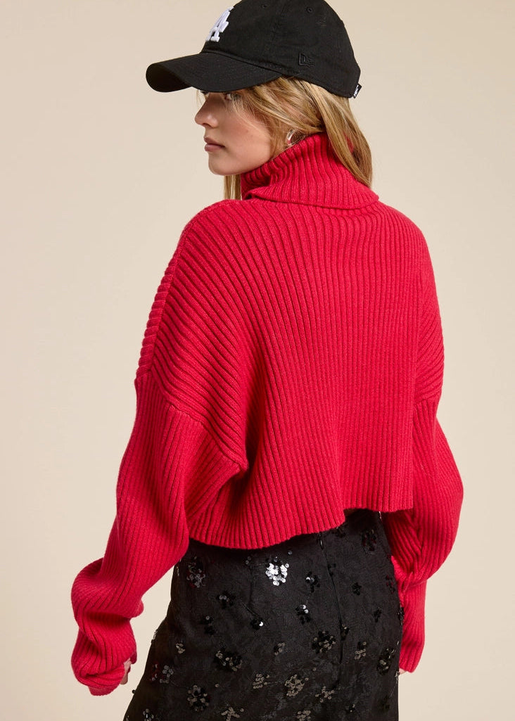Made from a solid ribbed knit fabric, this cropped turtleneck sweater features long sleeves, a boxy fit, and dropped shoulders for a relaxed silhouette. The high neck adds warmth while the cropped hem balances out the cozy texture with a modern, sporty edge. Pair it with joggers or wide-leg denim for an easy-cool vibe.