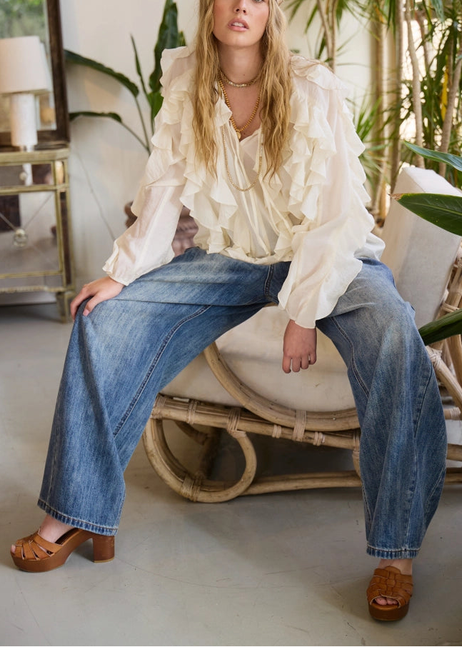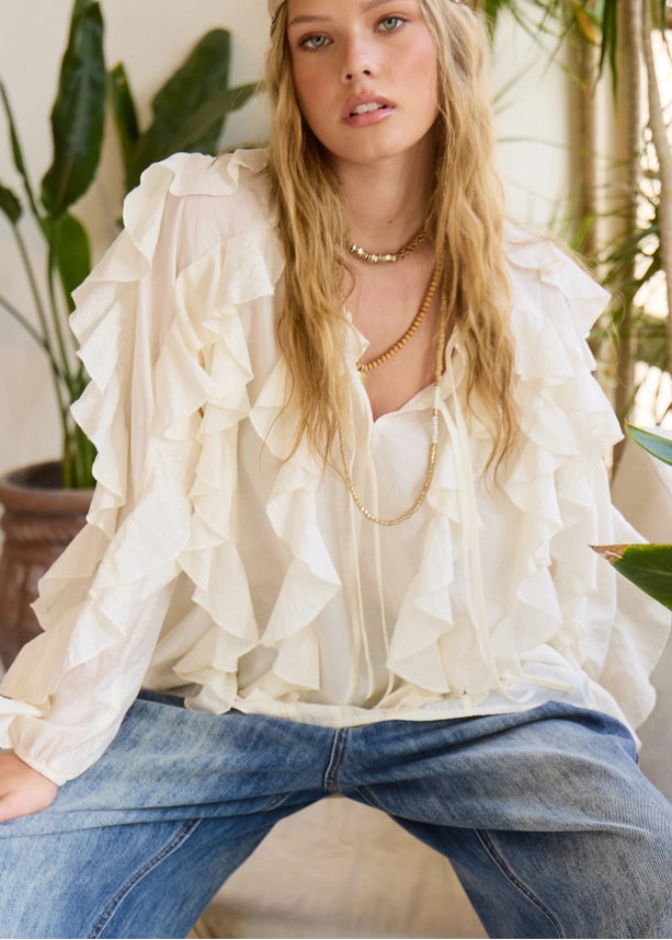 Softly structured with a romantic edge, this long sleeve blouse features cascading ruffles along the front and sleeves for effortless boho flair. Crafted from a lightweight rayon-Tencel blend, it’s designed with a V-neckline, adjustable tie front, and billowy sleeves finished with elastic cuffs. The relaxed silhouette drapes beautifully for everyday ease—whether styled with denim cutoffs, maxi skirts, or tailored trousers.