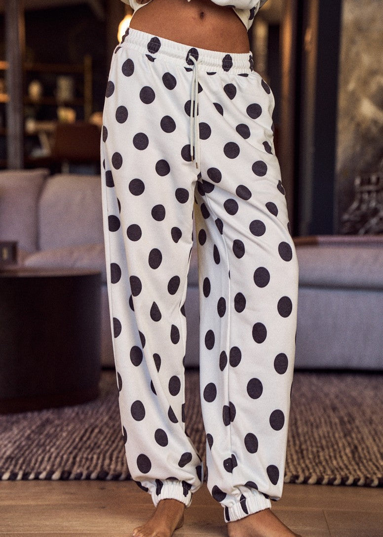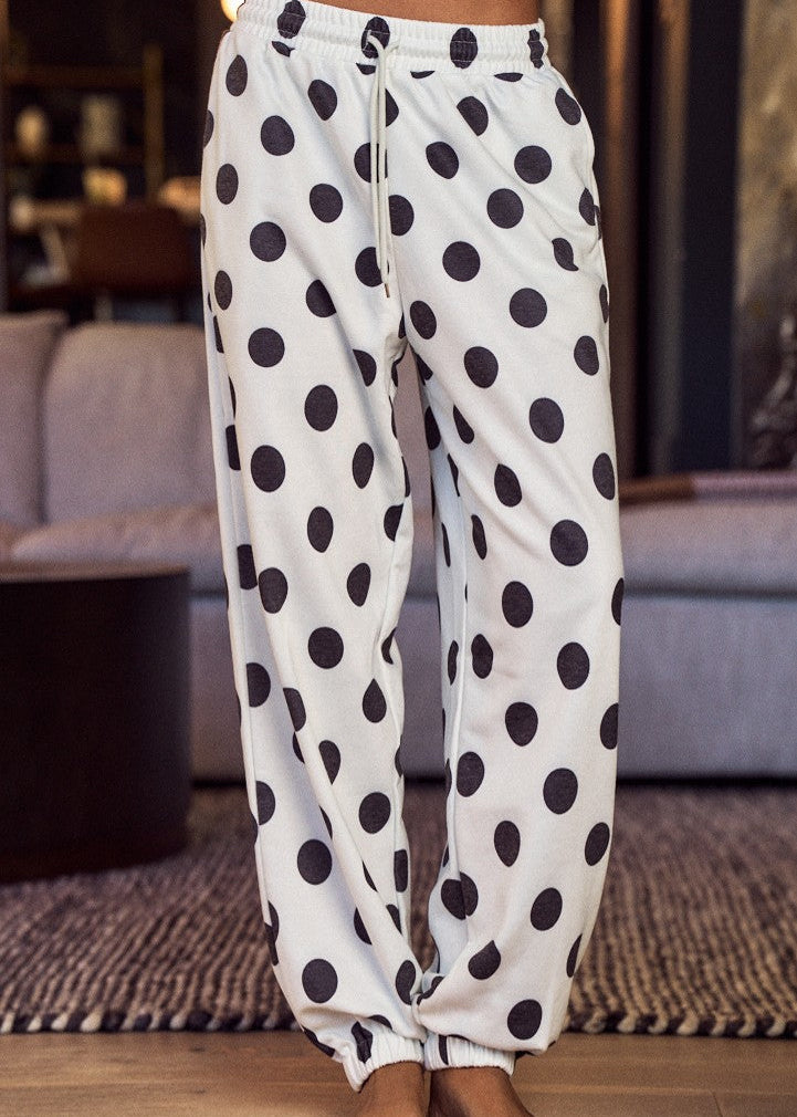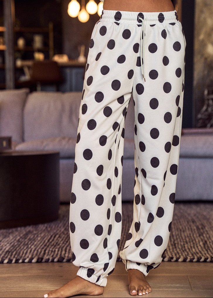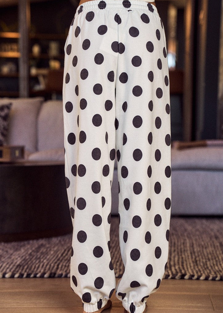 Slip into comfort with these charming polka dot string pants featuring an elastic waist for the perfect fit. The playful dot pattern adds a fun pop of personality to your casual wardrobe, while the lightweight fabric keeps you cool and comfortable all day long. Whether you're lounging at home or running errands, these easy-to-wear pants deliver style without sacrificing comfort. Perfect for anyone who loves a touch of whimsy in their everyday look.