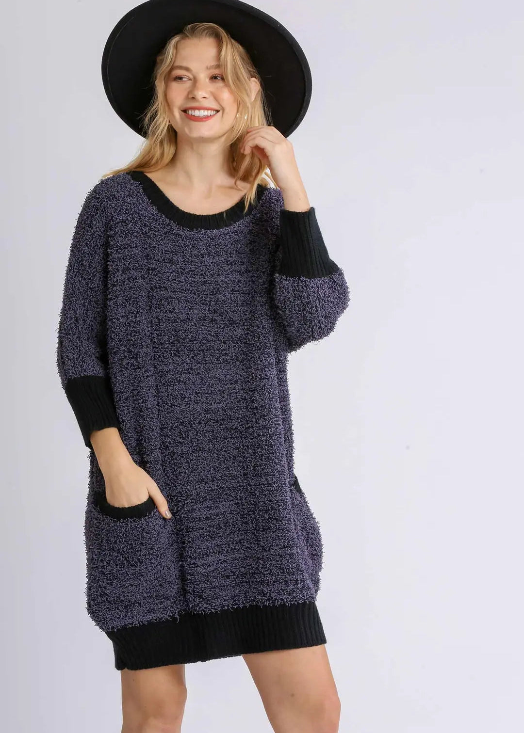 Round Neck 3/4 Sleeve Sweater Dress with Pockets and Ribbed Hem