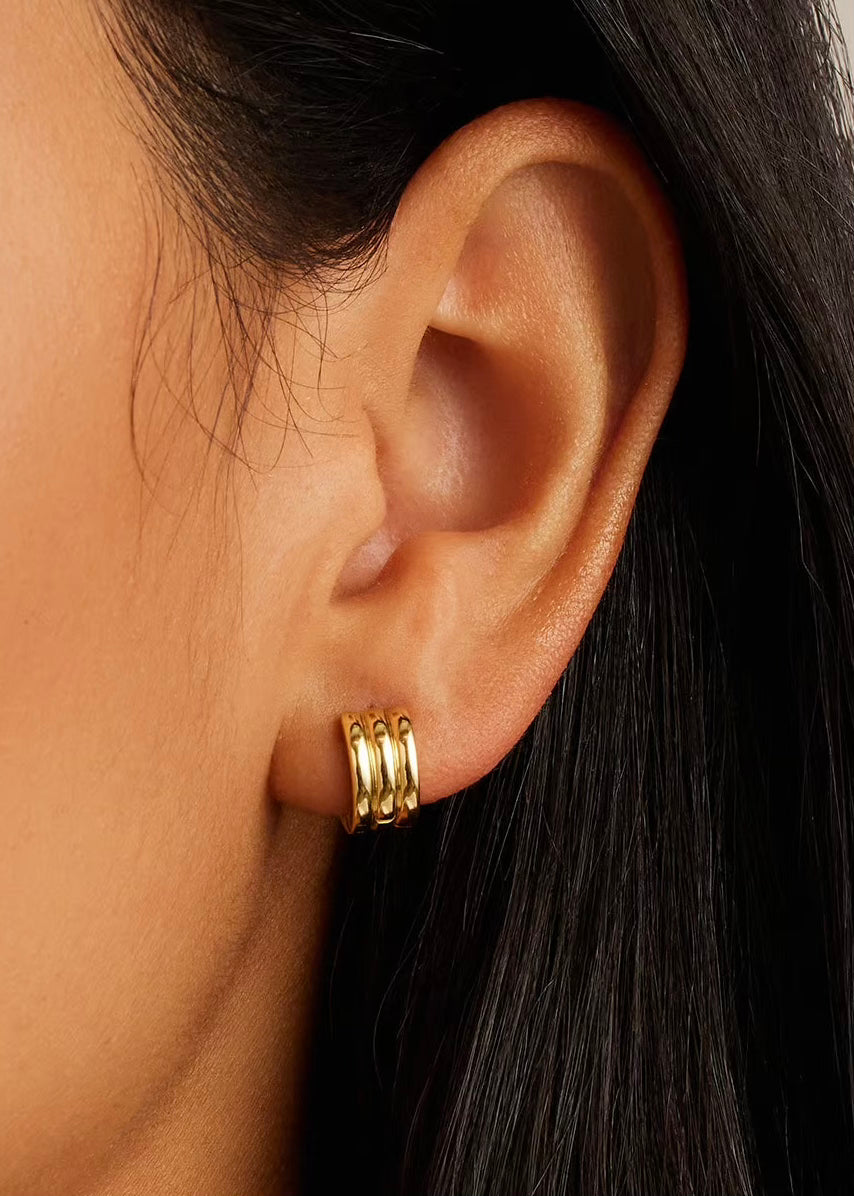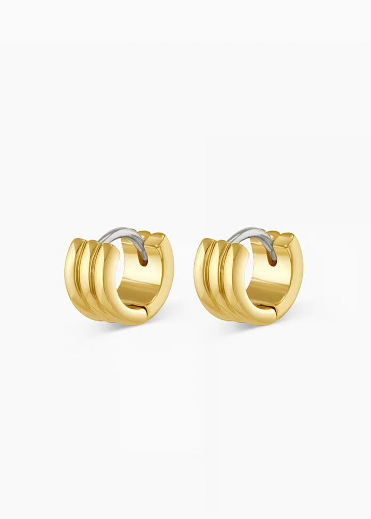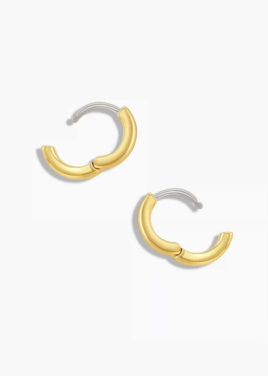 The Reed Huggies add instant style to any look with their modern-style design. Crafted with a gold plated finish, these classic hoop earrings are perfect worn solo or stacked in first piercings alongside your favorite stud earrings and huggie earrings.