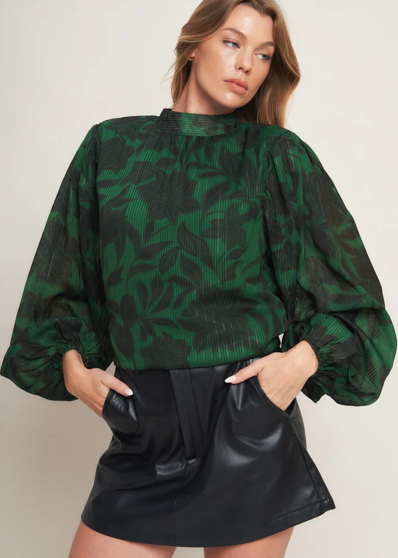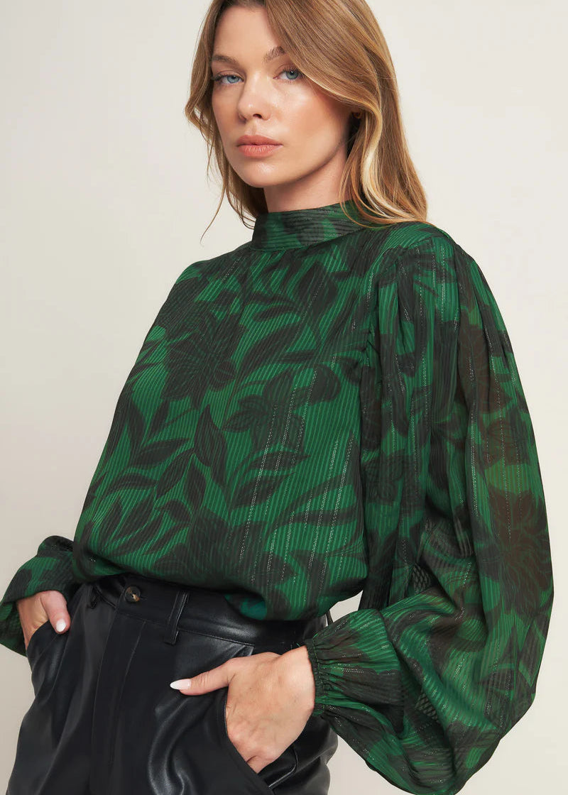 A printed woven top featuring high neckline, long blouson sleeve and back neck tie closure.