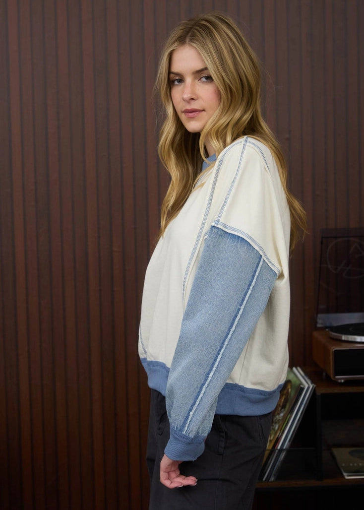 Layer up with this playful pullover that mixes textures and tones for effortless style. Featuring a relaxed crew neck, dropped shoulders, and extended sleeves with denim contrast detailing, it's the perfect blend of cozy knit and cool mixed media. The colorblock design keeps things fresh and fun—a versatile piece that's anything but boring.